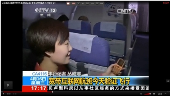 2014年4月16日,CCTV13新闻频道在《地空互联 网络云端:宽带互联网航班今天验证飞行》新闻中报道国航在北京飞往成都,成都飞往北京的航班上,首次进行了地空互联网宽带飞行上网通信测试。我公司行业用移动终端DynaPhone E30成功应用在此次通信测试中。E30采用WiFi无线通讯方式,充分满足了此次测试对通讯的实时性、可靠性等的性能要求。
