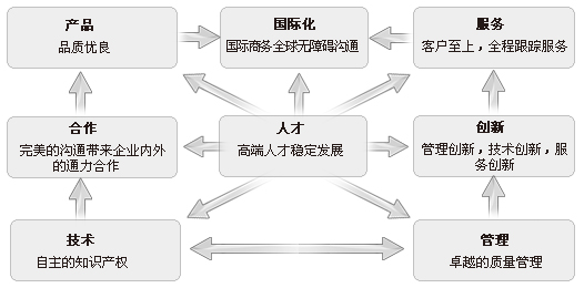以“人才”为核心,以“技术”和“管理”为基础,通过全方位的“合作”精神与锐意进取的“创新”精神,为客户提供优质的“产品”与“服务”,最终实现企业“国际化”目标。